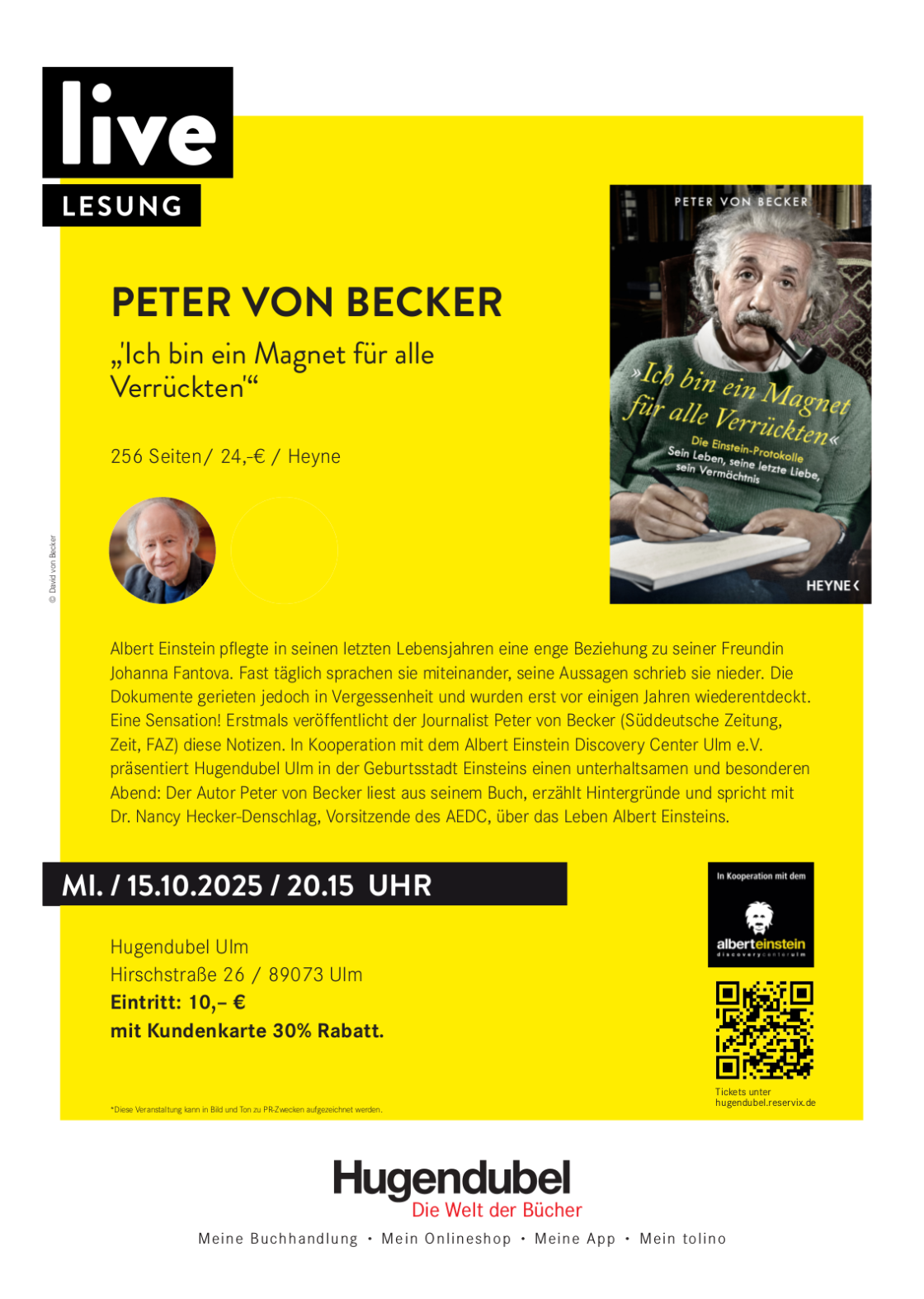 Am Mittwoch, 15.10.2025 um 20.15 Uhr präsentiert die Buchhandlung Hugendubel Ulm, Hirschstraße 26, 89073 Ulm, in Kooperation mit uns, dem Albert Einstein Discovery Center Ulm e.V. einen unterhaltsamen und besonderen Abend.